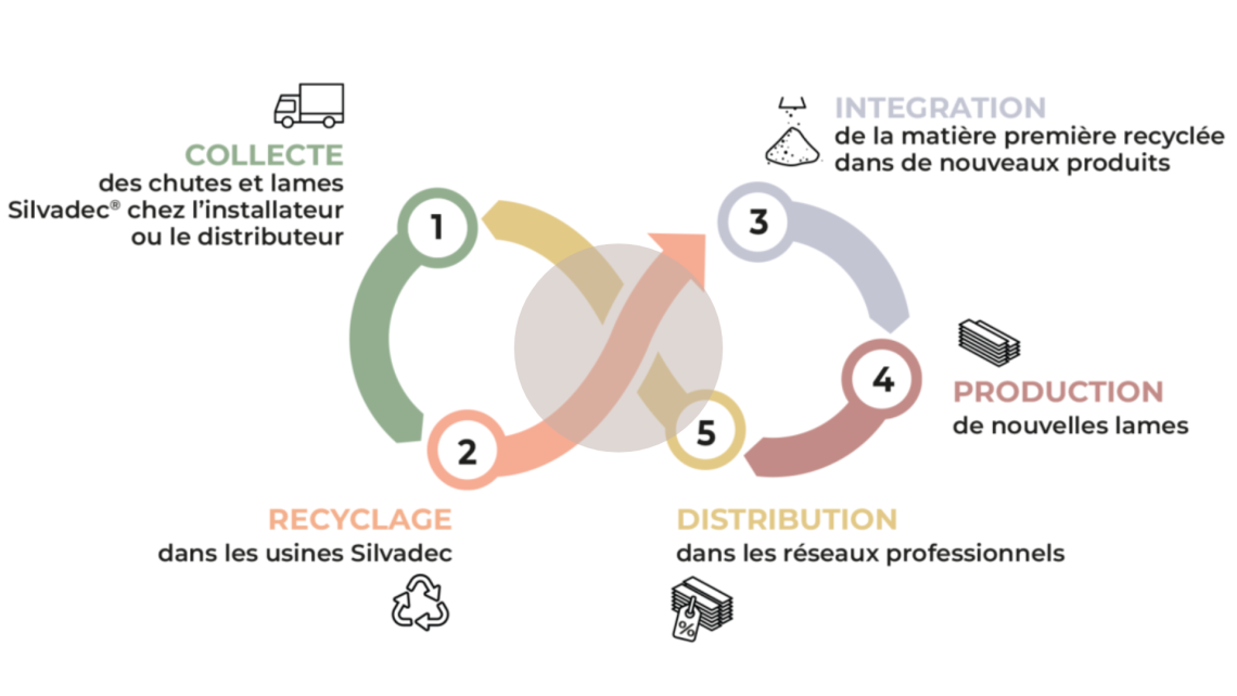Notre programme en boucle fermée transforme vos chutes de chantier ou ancienne terrasse Silvadec en nouvelles lames made in France, grâce à nos dispositifs de collecte exclusifs et notre unité de production et recyclage intégrée.