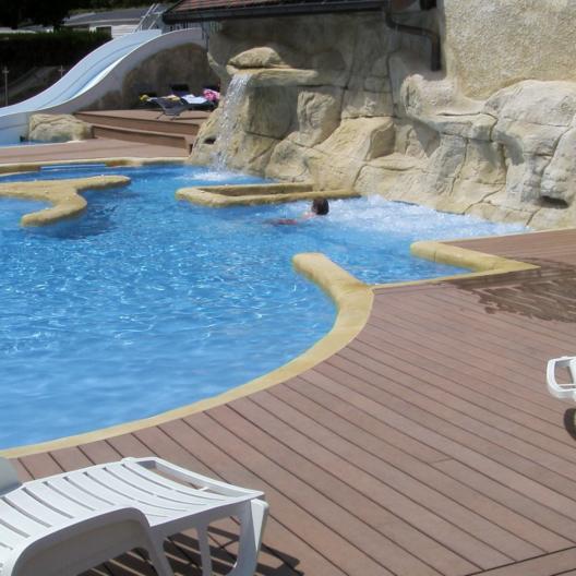 Les lames Élégance et Émotion présentent une structure monoextrudée authentique. Sans enveloppe protectrice, l'aspect bois naturel reste visible et évolue au fil des saisons, nécessitant un entretien périodique adapté. La teinte se patine naturellement avec le temps. L'installation échelonnée, le positionnement de mobilier ou d'éléments décoratifs peut générer des nuances chromatiques entre les différentes zones.
