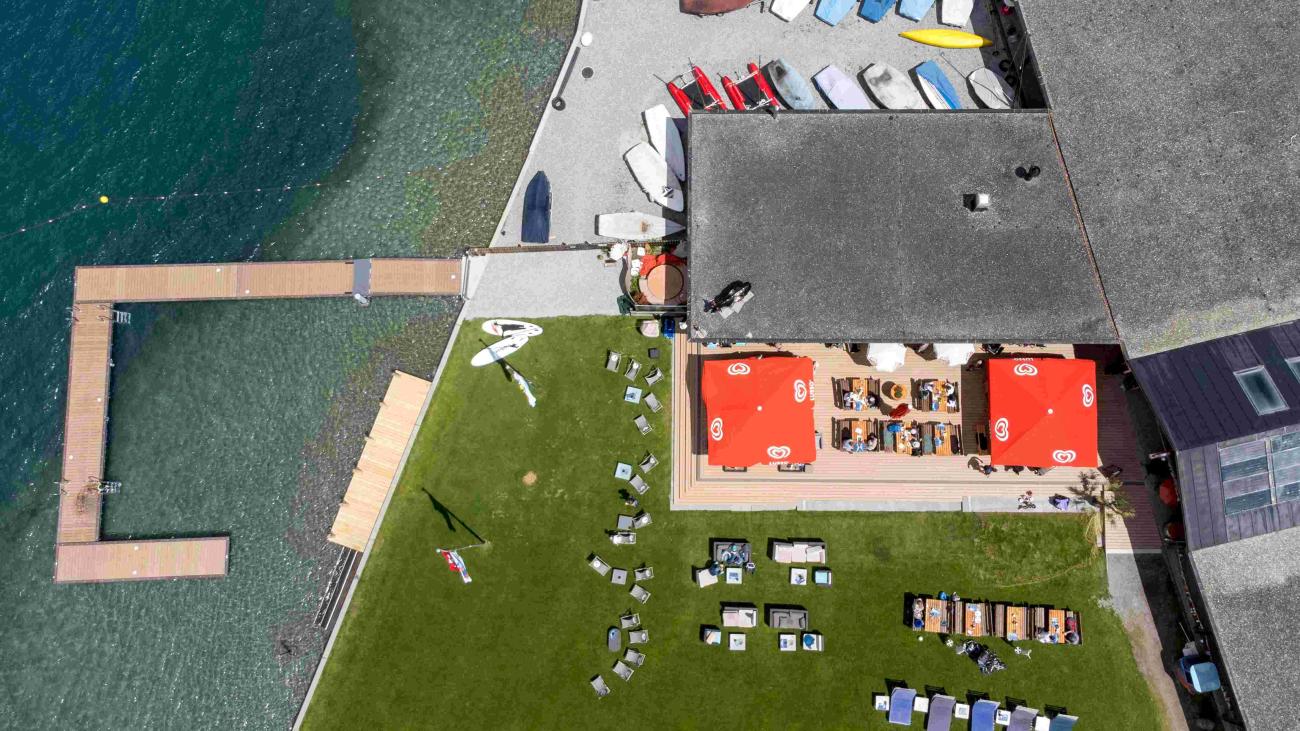 Terrasse restaurant et lac de baignade naturelle Davos, Suisse