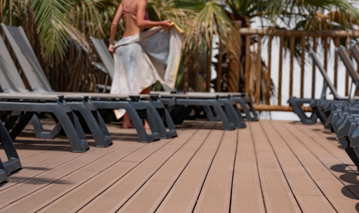 De heldere kleur van dit product biedt gebruikers op blote voeten een uniek comfort: in de zon voelt het materiaal niet warmer aan dan een exotische houtsoort.